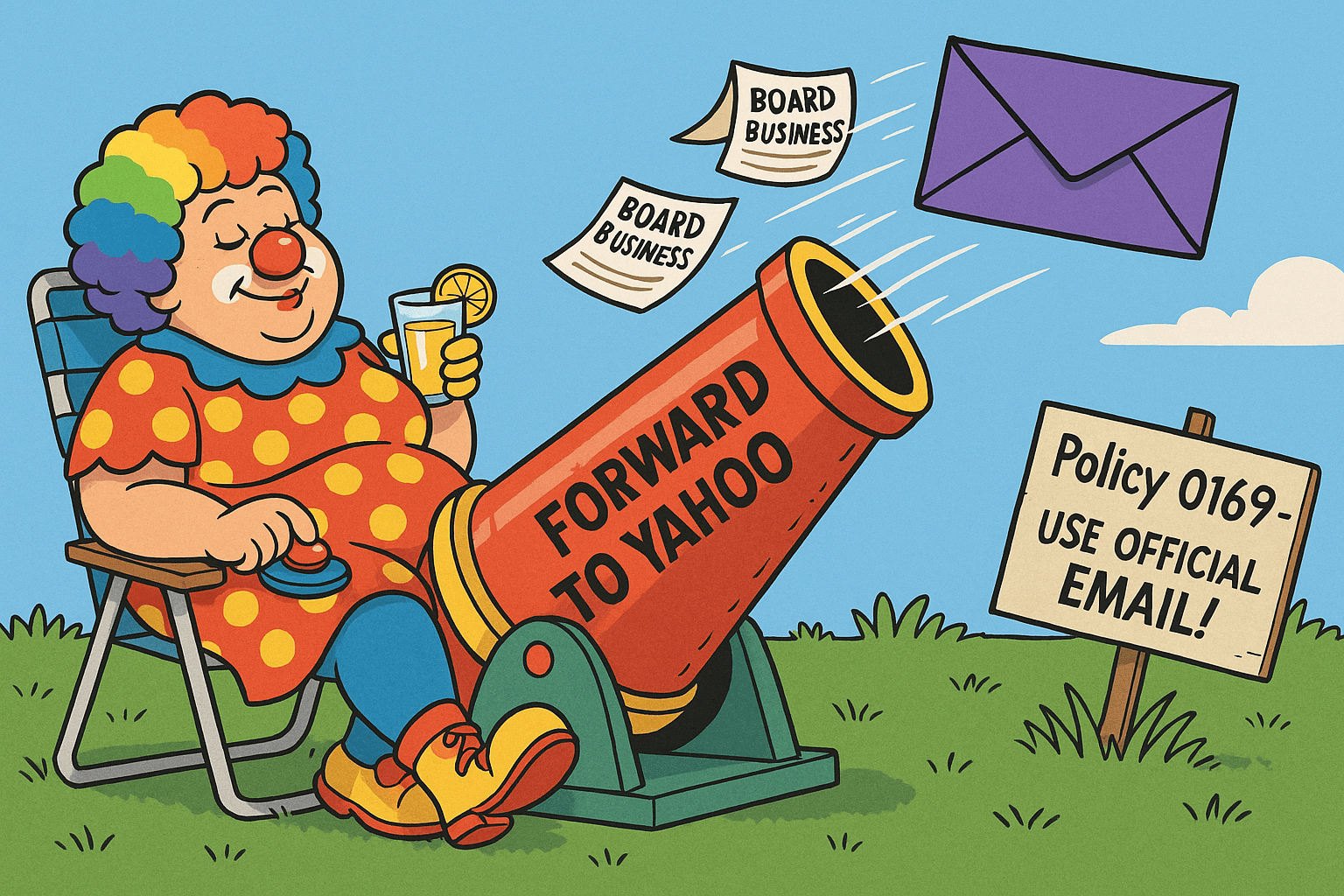 Forwarding confidential drafts and legal memos to a private Yahoo account flunks all three bullets. The policy even warns that improper disclosure “may compromise the Board or Board member.” Guess we’re there.